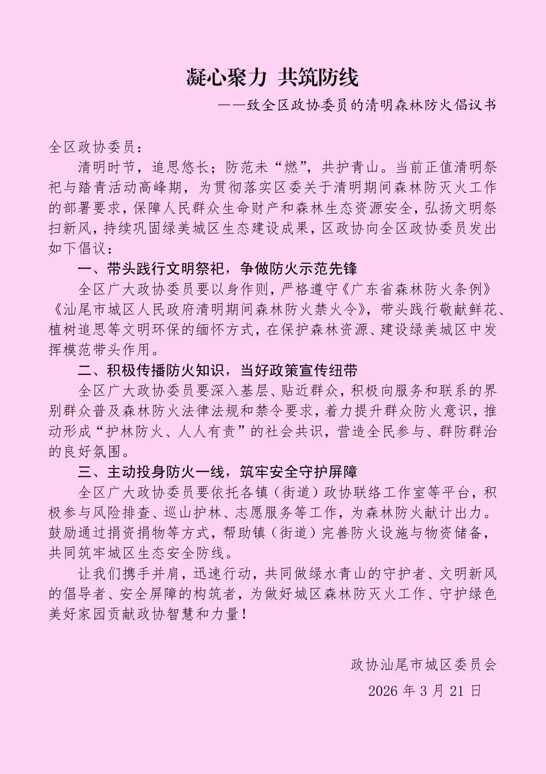 凝心聚力 共筑防线——致全区政协委员的清明森林防火倡议书